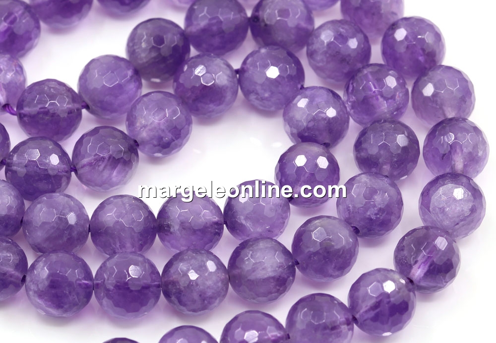 Amethyst beads, shape: round faceted, size: 10mm, string length: 40-41cm. The price is for a string without a clasp.