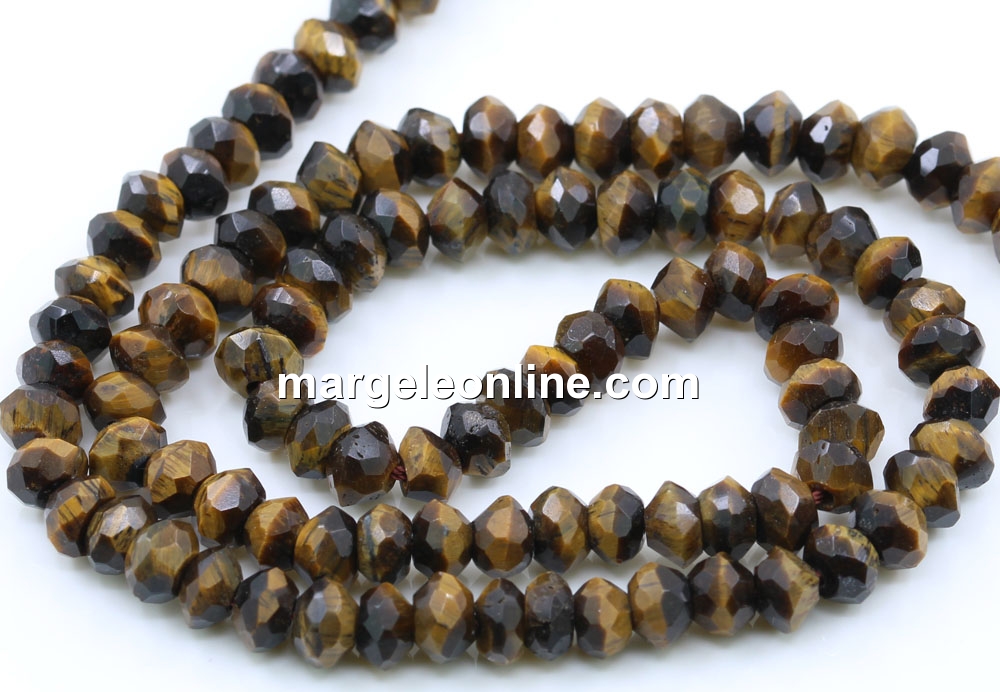 Brown tiger eye beads, shape: faceted round, size: 6x3.5mm, string length: 39.5cm. The price is for a string without a clasp.