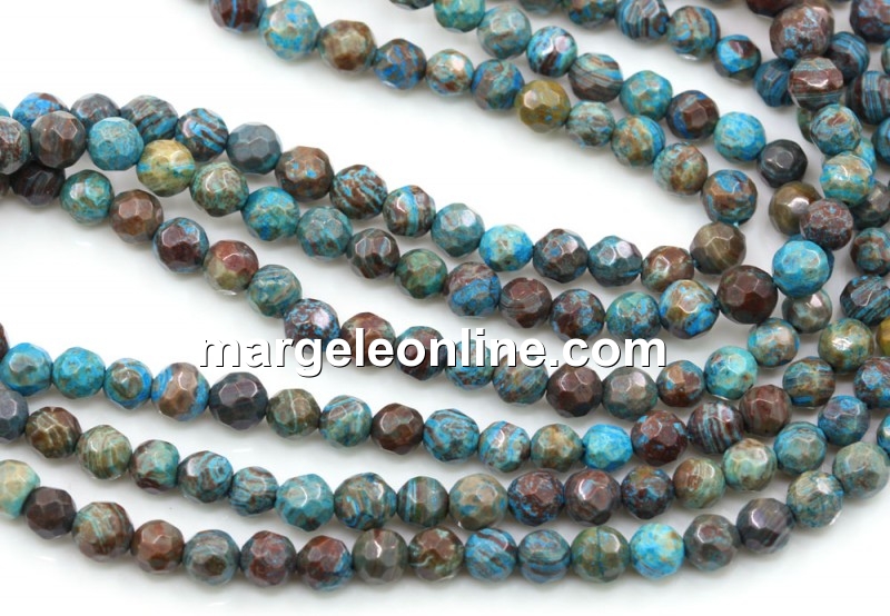 Blue turquoise calcsilica jasper beads, multi-colored, shape: faceted round, size: 4mm, string length: 39-40cm. The price is for one string without a clasp.