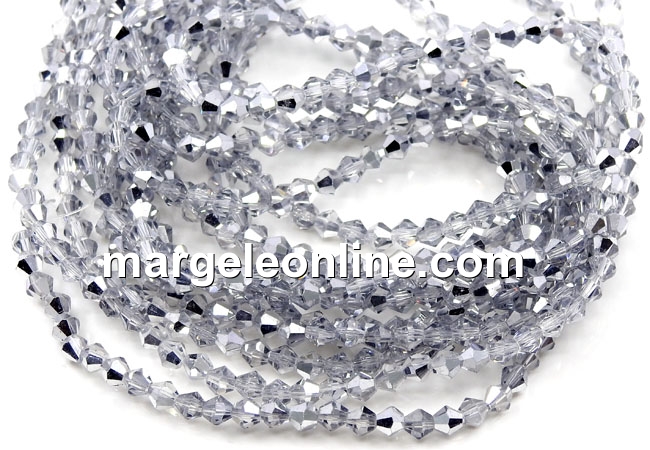 Crystal bead string, faceted biconical, transparent, size: 4mm, hole size: 1mm. The price is for 1 string of approx. 36cm.