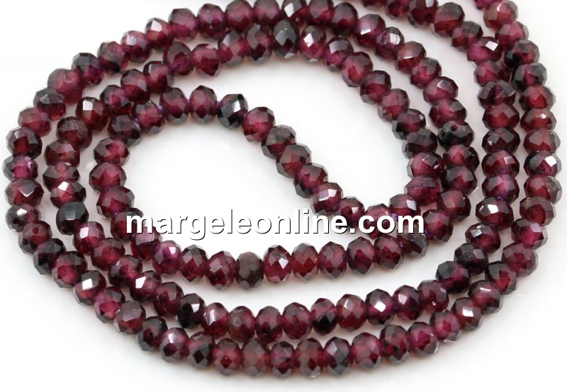 Garnet beads, shape: faceted rondelle, size: 3x2.3mm, string length: 40cm. The price is for a string without a clasp.