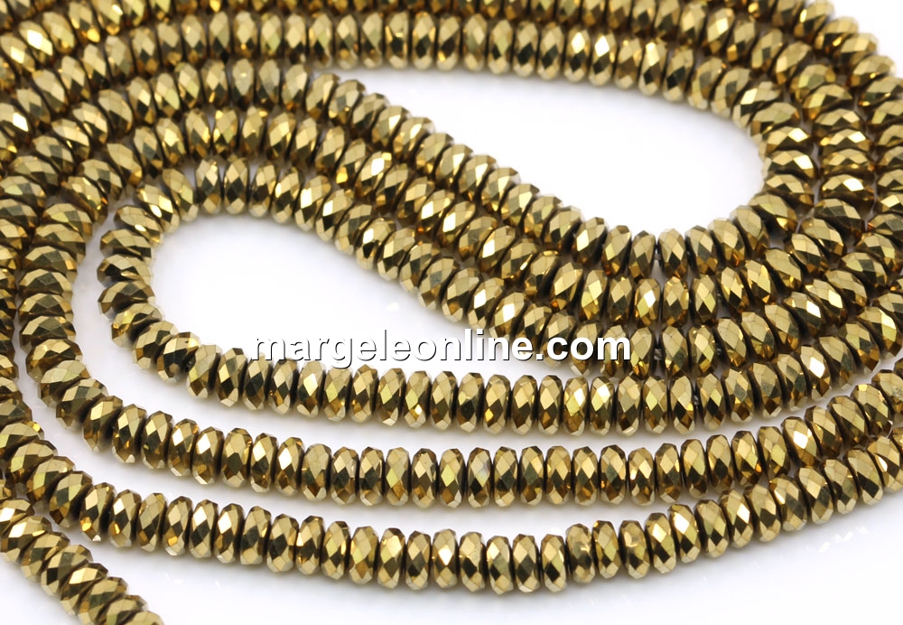 Hematite beads, faceted roundel, gold, 4mm