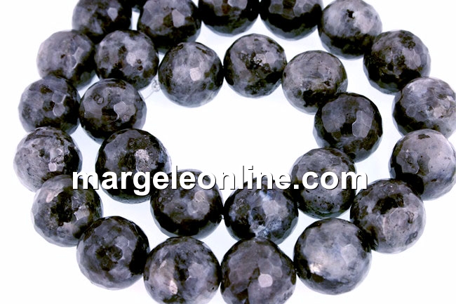 Larvikiteite beads, labradorite known allbastru, color: shades of Grey and black with blue reflections, shape: round faceted, size: 12mm, string length: 40cm. Price is for a string of 32 beads.