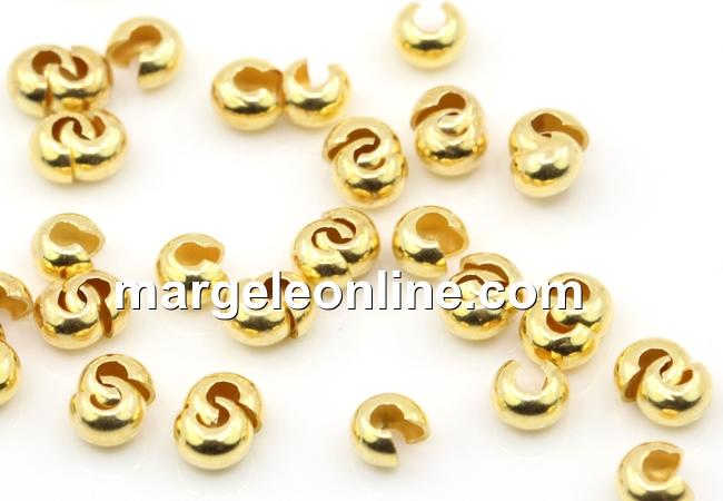 Acoperitor crimp: accesorii bijuterii argint 925 placat cu aur de 18K, un ton mai deschis decat cel de 24K, dimensiune: 3.5x2.2mm. Pretul se refera la 2 bucati.