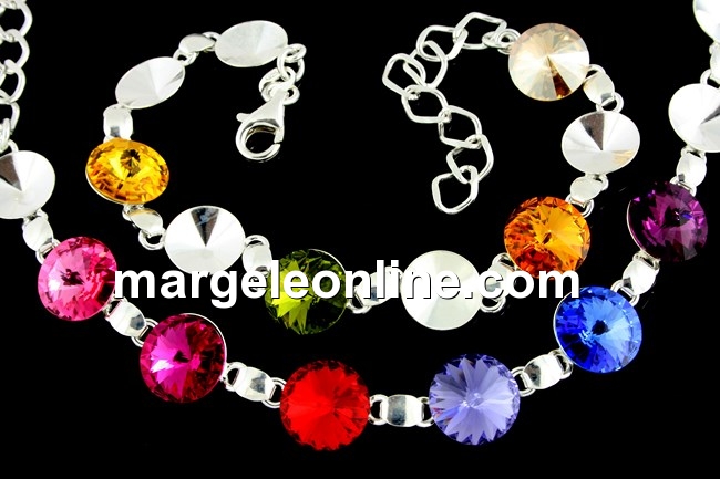 Baza pentru bratara, cu 7 linkuri pentru rivoli de 14mm, lungime: 17cm, prevazuta cu lantisor extensie 5cm, material: accesorii bijuterii argint 925 placat cu rodiu , marcat. Pretul este pentru 1 bucata. Cristalele din imagine sunt cu titlu de prezentare si pot fi achizitionate din categoria Swarovski rivoli sau fancy rivoli.
