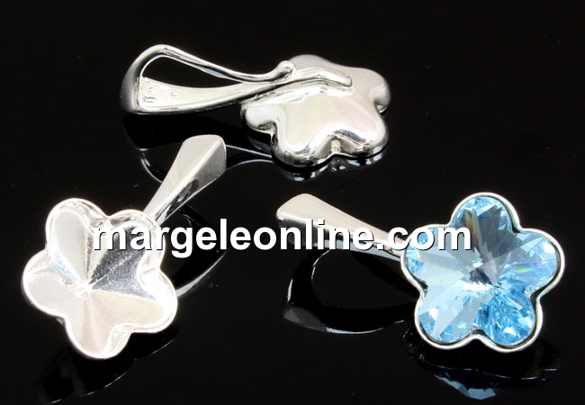 Baza pandantiv pentru floare Swarovski 4744 10mm, material: accesorii bijuterii argint 925 placat cu rodiu, marcat, dimensiune: 18.5x10.5mm. Pretul se refera la 1 bucata. Produsul din imagine este cu titlu de prezentare si poate fi achizitionat din categoria Swarovski fancy rivoli.
