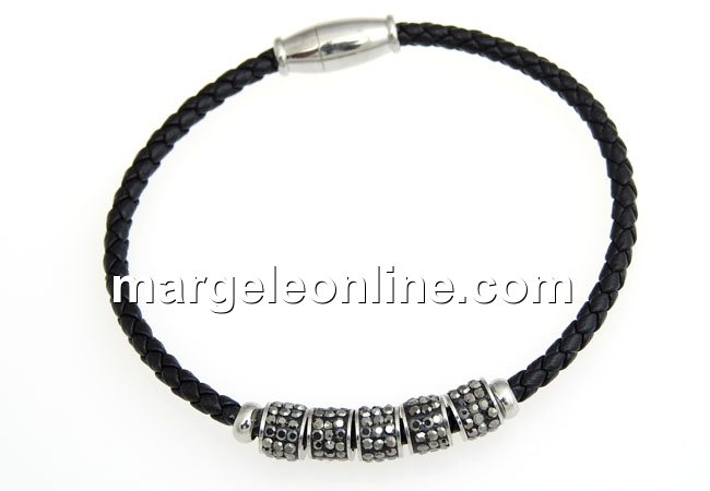 Bratara cu incuietoare magnetica, din piele neagra impletita, cu 5 charmuri tubulare de 5x6.5mm, prevazute cu cristale, grosime bratara 3mm, diametru interior 57mm. Este o bratara de calitate foarte buna cu un aspect impecabil si comparabil cu produsele marilor brand-uri. Pretul este pentru 1 bratara.