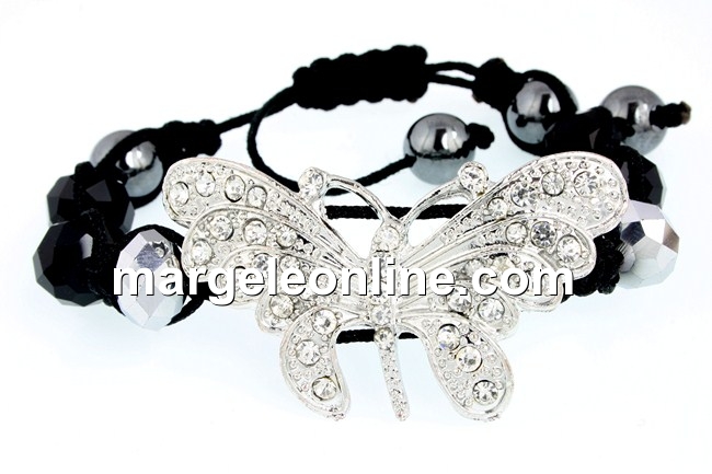Bratara shamballa cu link fluture cu 30 cristale, marime link: 53x29mm, 4 margele hematit de 10mm si 6 cristale fatetate de 12mm, realizata cu nod reglabil culisant. Pretul se refera la 1 bratara.