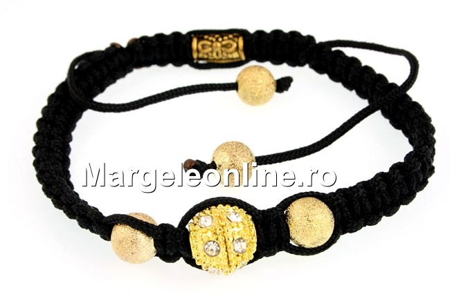 Bratara shamballa cu 3 margele: metal incrustat cu cristale, bila de 10mm, metal praf de stele aurii de 8mm, accesoriu tub auriu antichizat de 10x5mm, realizata cu nod reglabil culisant. Pretul se refera la 1 bratara.