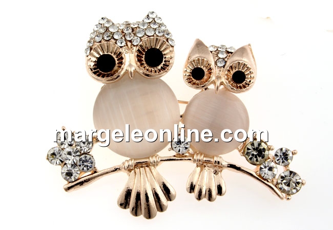 Brosa, bufnite cu cristale si ochi de pisica, 43x54mm - x1