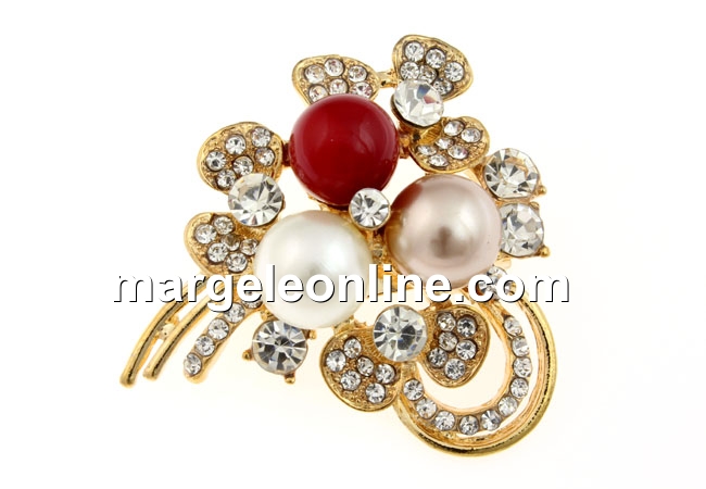 Brosa, floare cu cristale si perle, 48x44mm - x1