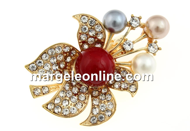 Brosa, floare cu cristale si perle, 53x34mm - x1