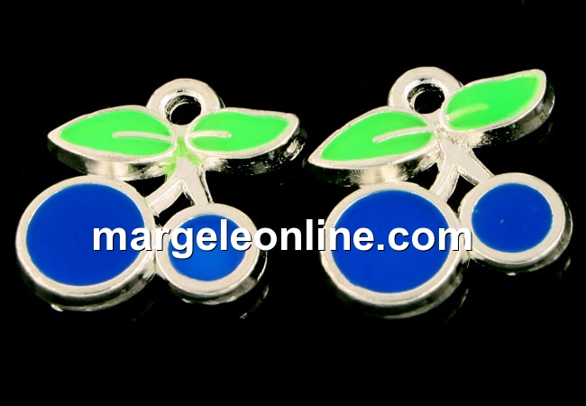Charm metalic emailat, cirese, albastru, 12mm - x5