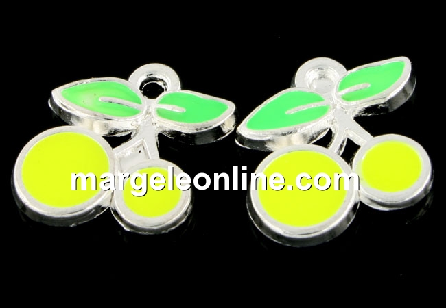 Charm metalic emailat, cirese, galben neon, 12mm - x5