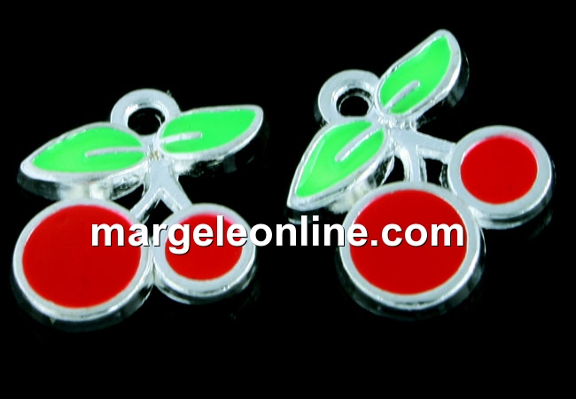 Charm metalic emailat, cirese, rosu, 12mm - x5