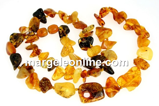 Colier din margele chips de chihlimbar natural, dimensiune variabila progresiva chips: 10-18mm, lungime totala colier: 55cm, prevazut cu incuietoare cu filet. Pretul este pentru 1 colier.