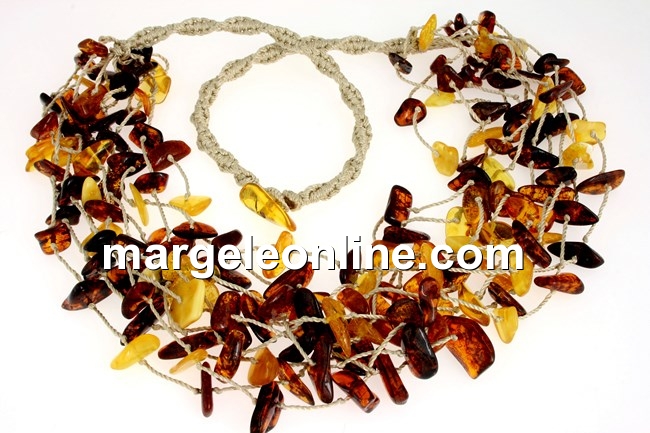 Colier din margele chips de chihlimbar natural, dimensiune variabila progresiva chips: 11-15mm, lungime totala colier: 55cm, realizat din 10 siraguri. Pretul este pentru 1 colier.