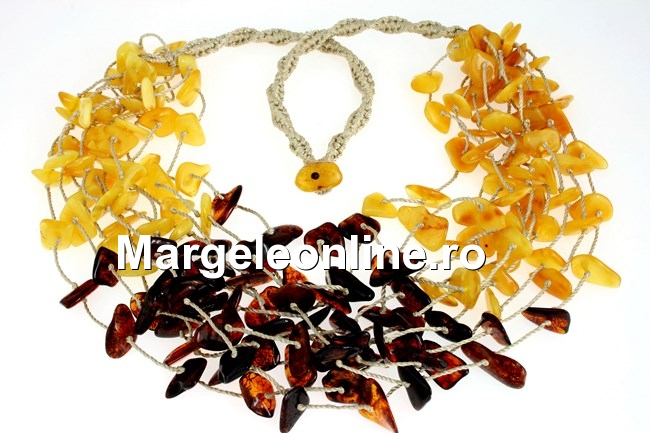 Colier din margele chips de chihlimbar natural, dimensiune variabila progresiva chips: 11-15mm, lungime totala colier: 55cm, realizat din 10 siraguri. Pretul este pentru 1 colier.