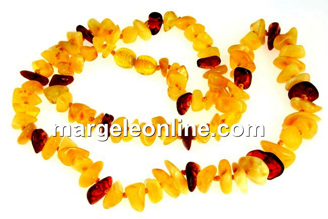 Colier din margele chips de chihlimbar natural, dimensiune variabila progresiva chips: 6-14mm, lungime totala colier: 48cm, prevazut cu incuietoare cu filet. Pretul este pentru 1 colier.
