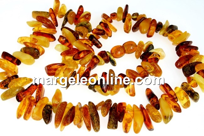 Colier din margele chips de chihlimbar natural, dimensiune variabila progresiva chips: 7-17mm, lungime totala colier: 46-47cm, prevazut cu incuietoare cu filet. Pretul este pentru 1 colier.