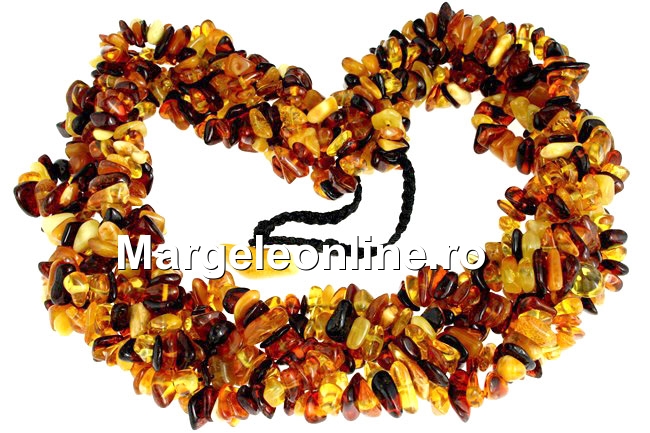 Colier din margele chips de chihlimbar natural, realizat pe 5 randuri impletite, dimensiune variabila chips: 8-10mm, lungime totala colier: 52cm. Pretul este pentru 1 colier.