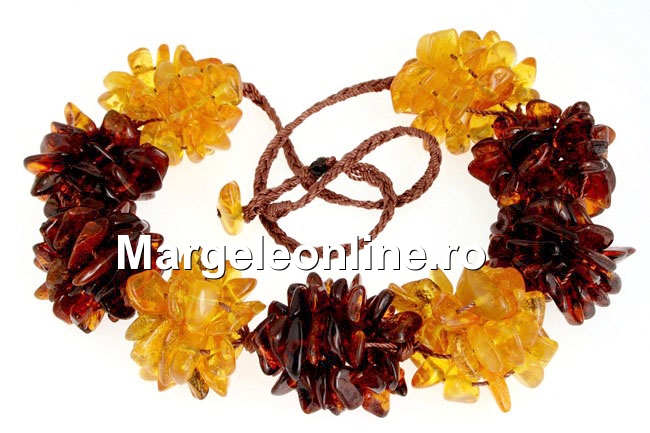 Colier din margele chips de chihlimbar natural, dimensiune variabila progresiva chips: 8-11mm, realizat cu 9 buchete cu diametru: 27-33mm. lungime totala colier: 50cm. Pretul este pentru 1 colier.