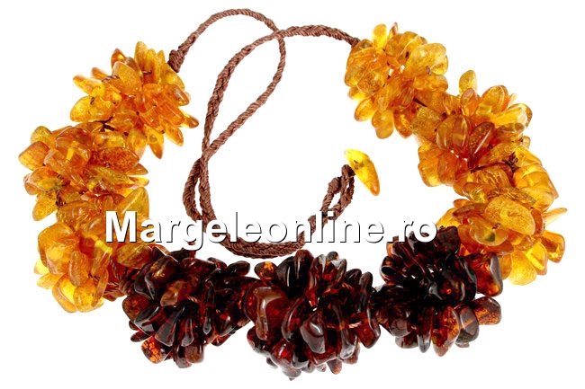 Colier din margele chips de chihlimbar natural, dimensiune variabila progresiva chips: 8-13mm, realizat cu 9 buchete cu diametru: 27-33mm. lungime totala colier: 50cm. Pretul este pentru 1 colier.