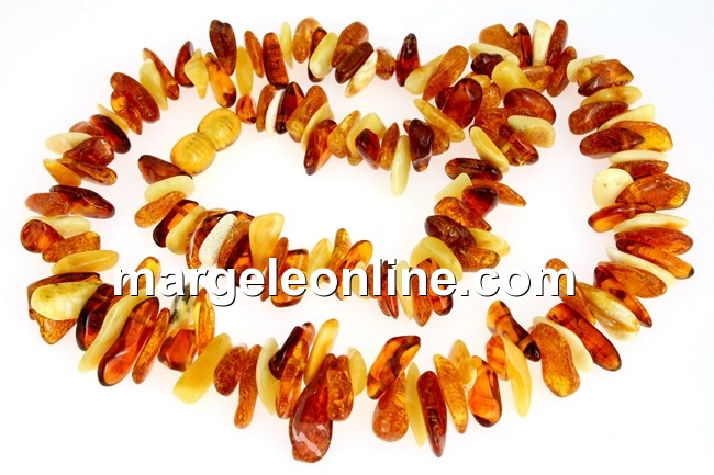 Colier din margele chips de chihlimbar natural, dimensiune variabila progresiva chips: 9-16mm, lungime totala colier: 47-48cm, prevazut cu incuietoare cu filet. Pretul este pentru 1 colier.