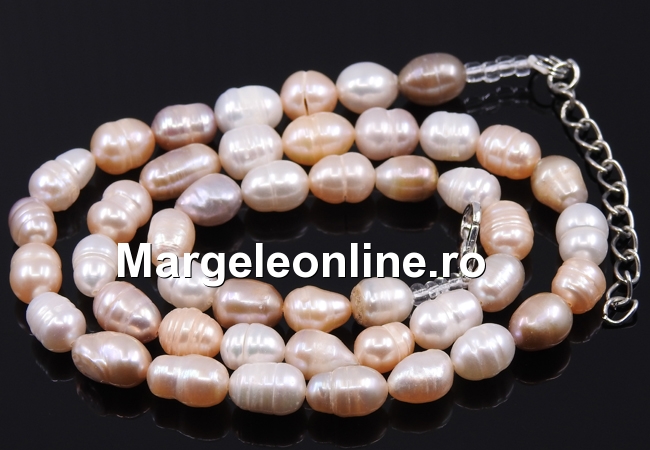 Colier din Perle de cultura naturale, lungime colier perle: 42cm, lungime totala cu lantisor de extensie inclus: 50cm , marime perle: 8-10mm, aspect: perlat lucios. Pretul se refera la 1 bucata.