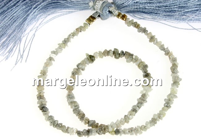 Diamant natural brut neprelucrat, forma: chips, culoare: argintiu, duritate Mohs 10, dimensiune progresiva: 1.8-4mm. Pretul este pentru un sirag de 20cm.