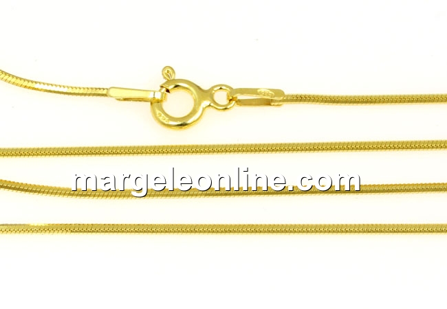 Lant din argint 925 placat cu aur, marcat, lungime: 50mm, grosime: 0.8x0.9mm, prevazut cu incuietoare, circular si usor aplatizat. Pretul este pentru 1 bucata.