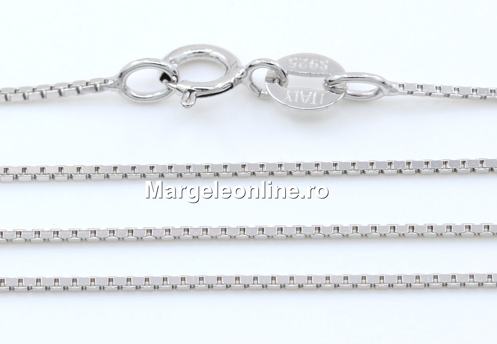 Lant din argint 925 placat cu rodiu, marcat 925, lungime: 45cm, grosime: 0.8mm, prevazut cu incuietoare. Pretul este pentru 1 bucata.