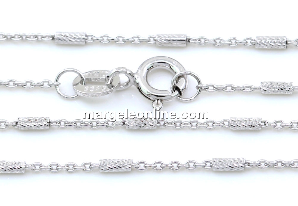 Lant din argint 925 placat cu rodiu, marcat 925, lungime: 45cm, grosime: 1.1-1.3mm, prevazut cu incuietoare. Pretul este pentru 1 bucata.