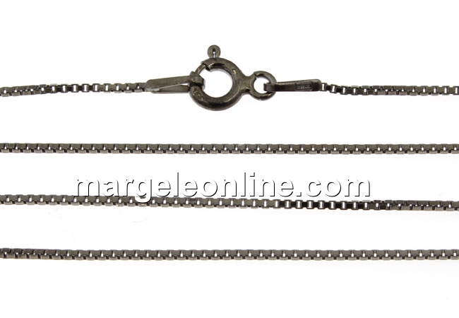 Lant din argint 925 placat cu rodiu negru, marcat, lungime: 45cm, grosime: 0.9mm, prevazut cu incuietoare. Pretul este pentru 1 bucata.