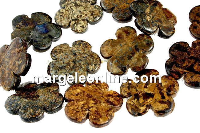 Margele bronzit natural, forma: floare, marime: 30x6.5mm. Pretul se refera la 1 sirag de 40cm cu 13 margele.