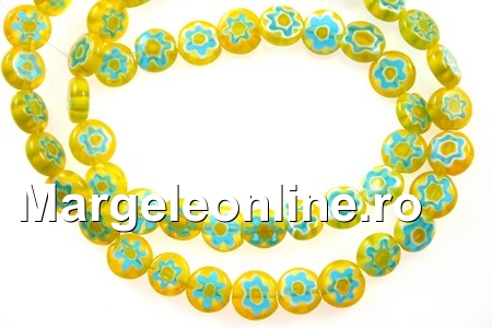 Margele sticla chevron, forma: disc, marime: 8x3.5mm, culoare: galben cu turcoaz. Pretul se refera la 1 sirag fara incuietoare de 40cm cu aproximativ 48-50 margele.