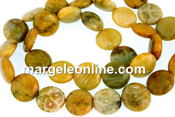 Margele coral fosil, forma: disc plat, marime: 12.5x5mm, lungime sirag: 39-40cm. Pretul se refera la 1 sirag de 39-40cm.