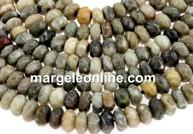 Margele coral fosil, forma: rondele fatetate, marime: 6x3.5mm. Pretul se refera la 1 sirag de 40cm.