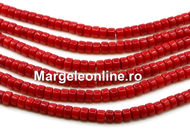Margele coral, culoare: rosu intens, forma: heishi disc, marime: 6x4mm. Pretul se refera la un sirag de cca 40cm.