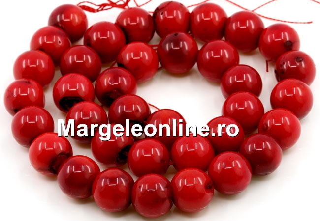 Margele coral, culoare: rosu intens, forma: rotund, marime: 11.5mm, margelele prezinta incluziuni si cavitati specifice coralului natural . Aceste "imperfectiuni" sunt apreciate de clientii care doresc o noata de originalitate pentru bijuterii. Pretul se refera la un sirag de cca 39cm.