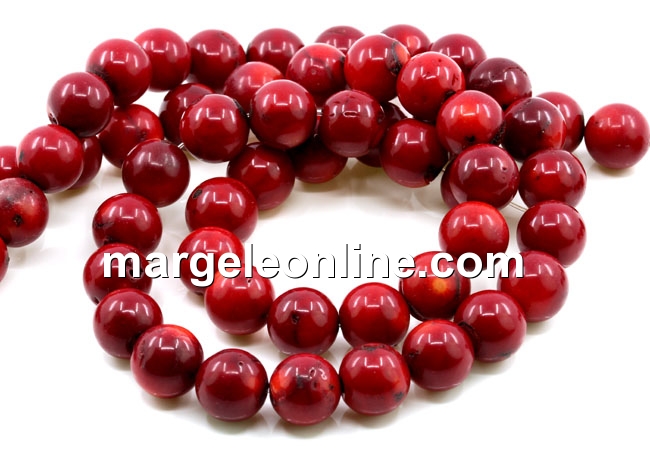 Margele coral, culoare: rosu intens, forma: rotund, marime: 14mm, margelele prezinta incluziuni si cavitati specifice coralului natural . Aceste "imperfectiuni" sunt apreciate de clientii care doresc o noata de originalitate pentru bijuterii. Pretul se refera la un sirag de cca 42cm.