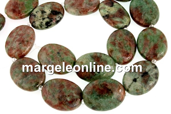 Margele granat verde natural , forma: oval plat, marime: 20x15mm, lungime sirag: 37cm. Pretul este pentru un sirag cu 18 margele.