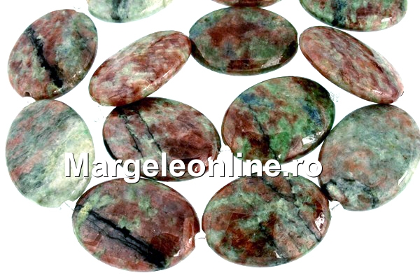 Margele granat verde natural, forma: oval plat, marime: 30x22mm, lungime sirag: 40cm. Pretul este pentru un sirag cu cu 13 margele.