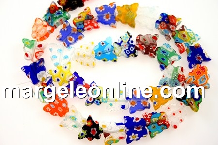 Margele sticla millefiori, forma: fluturi, marime: 12x10x4mm, culoare: multicolor. Pretul se refera la 1 sirag fara incuietoare de 40cm cu 39 margele.