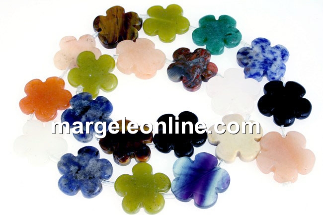 Margele cuart, ochi de tigru, aventurin, jasp, sodalit, jad, fluorit, onix, forma: floare, marime: 20x6mm. Pretul se refera la 1 sirag de 42cm cu 19-20 margele.