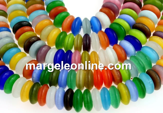 Margele sticla ochi de pisica , multicolor, dimensiune: 10x4mm. Pretul se refera la un sirag de 39.5cm cu 100 margele.