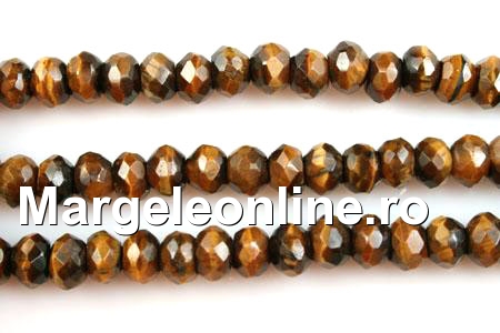 Margele ochi de tigru maro, forma: rondela fatetata, marime: 6x4mm, lungime sirag: 38-39cm. Pretul este pentru un sirag.