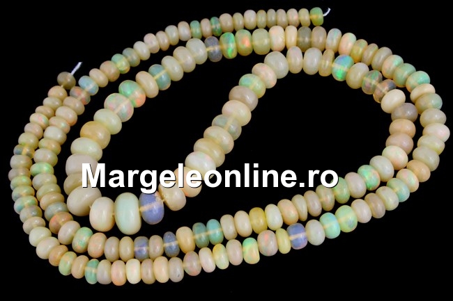 Margele opal natural etiopian auriu translucent cu irizatii, forma: rondele, marime: 4-6.5x2-4mm. Pretul se refera la siragul din imagine de 40cm si contine 163 margele.