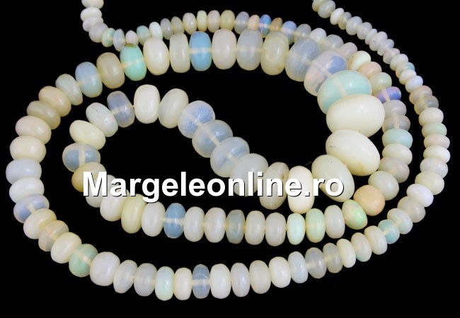Margele opal ethiopian natural ivory translucent cu irizatii, forma: rondele, marime: 3-8.5x1.8-5mm. Pretul se refera la siragul din imagine de 35cm.