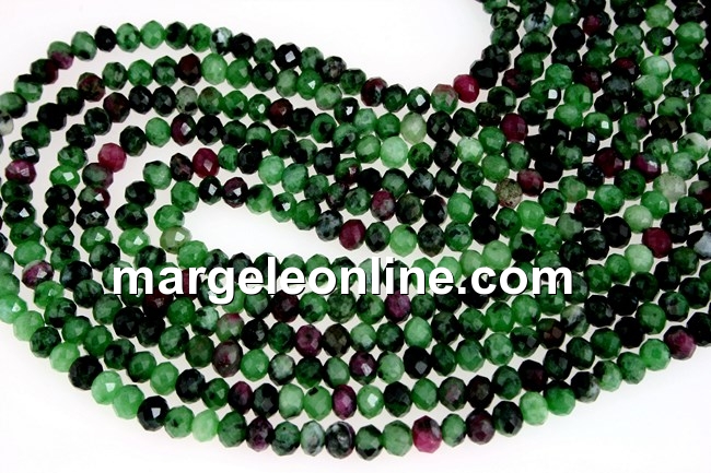 Margele rubin in zoisit, forma: rondela fatetata, marime: 4-4.5x3mm. Prezinta si rondele de rubin integral. Pretul este pentru 1 sirag de 40cm.